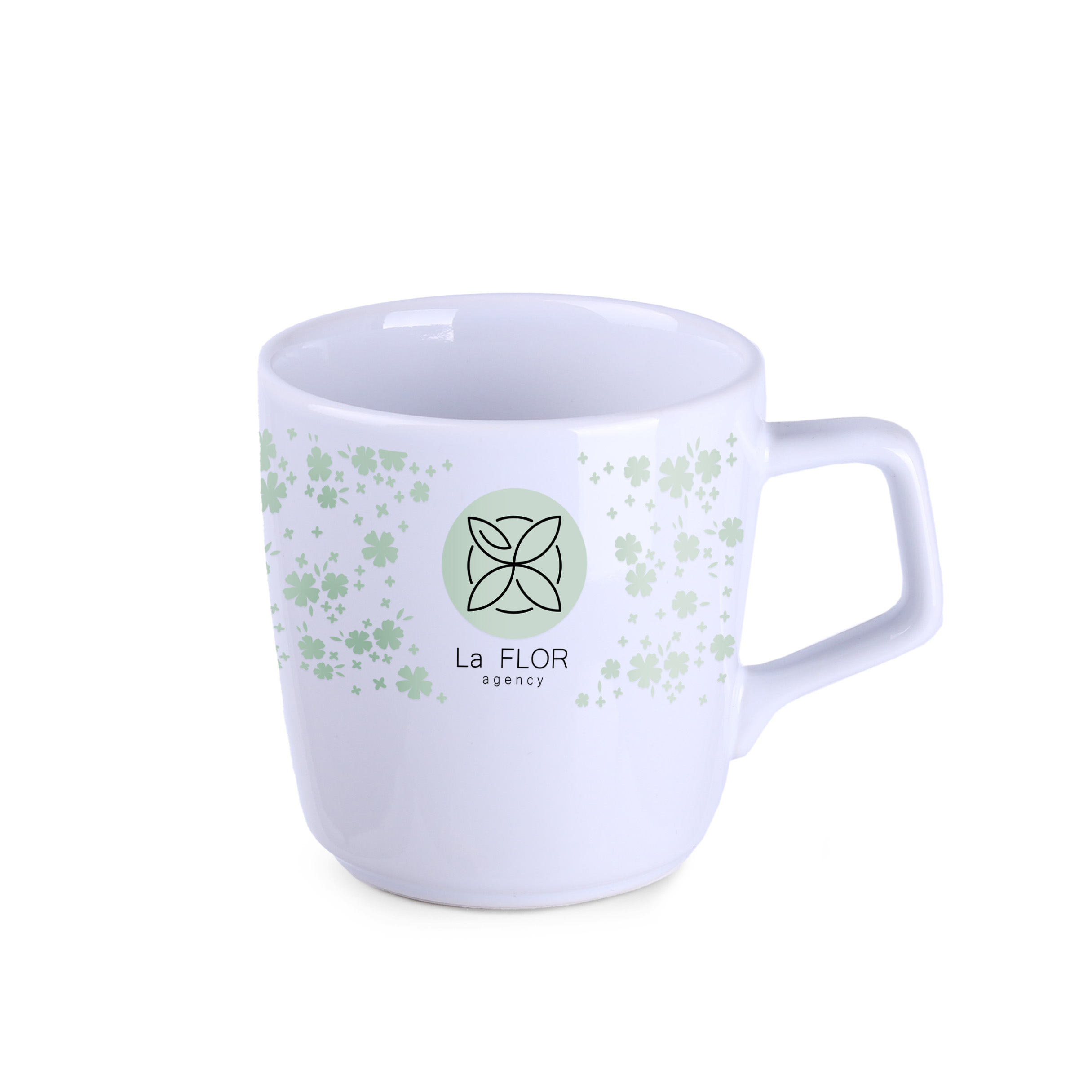 Porcelain mug with an oval shape. It has an original, eye-catching handle and extensive coloring possibilities.