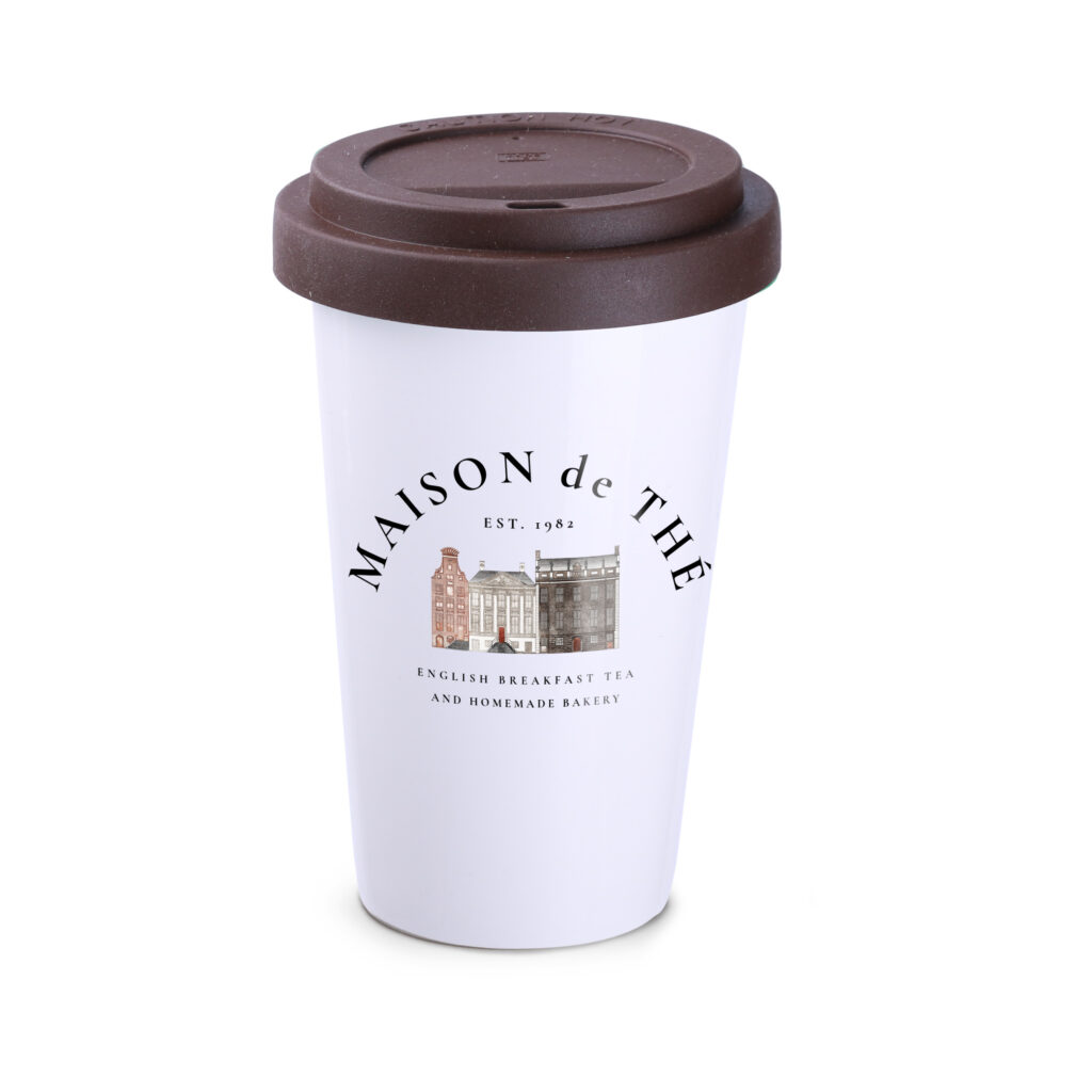 Mobile mug with great branding possibilities. Thanks to the double wall, it keeps the liquid inside warm for longer and protects your hands against burns. It has a silicone cover and a band, which are available in many color options.
