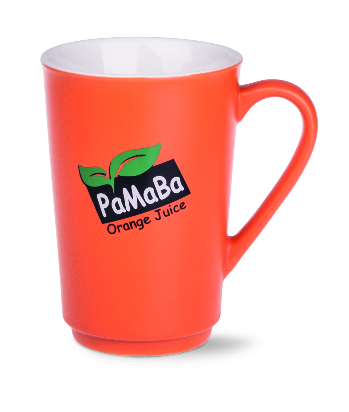 A slim advertising mug with a satin, colorful exterior and a white, glossy interior. It has a subtle rounded handle. Its simple walls will perfectly display even very large prints.