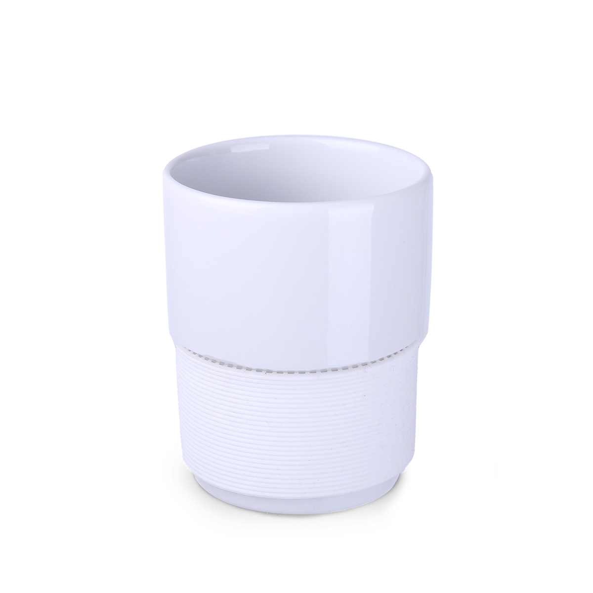 Medium sized ceramic advertising mug without handle. The 40mm wide bands are available in several colours: white, orange, red, navy blue, brown and black.