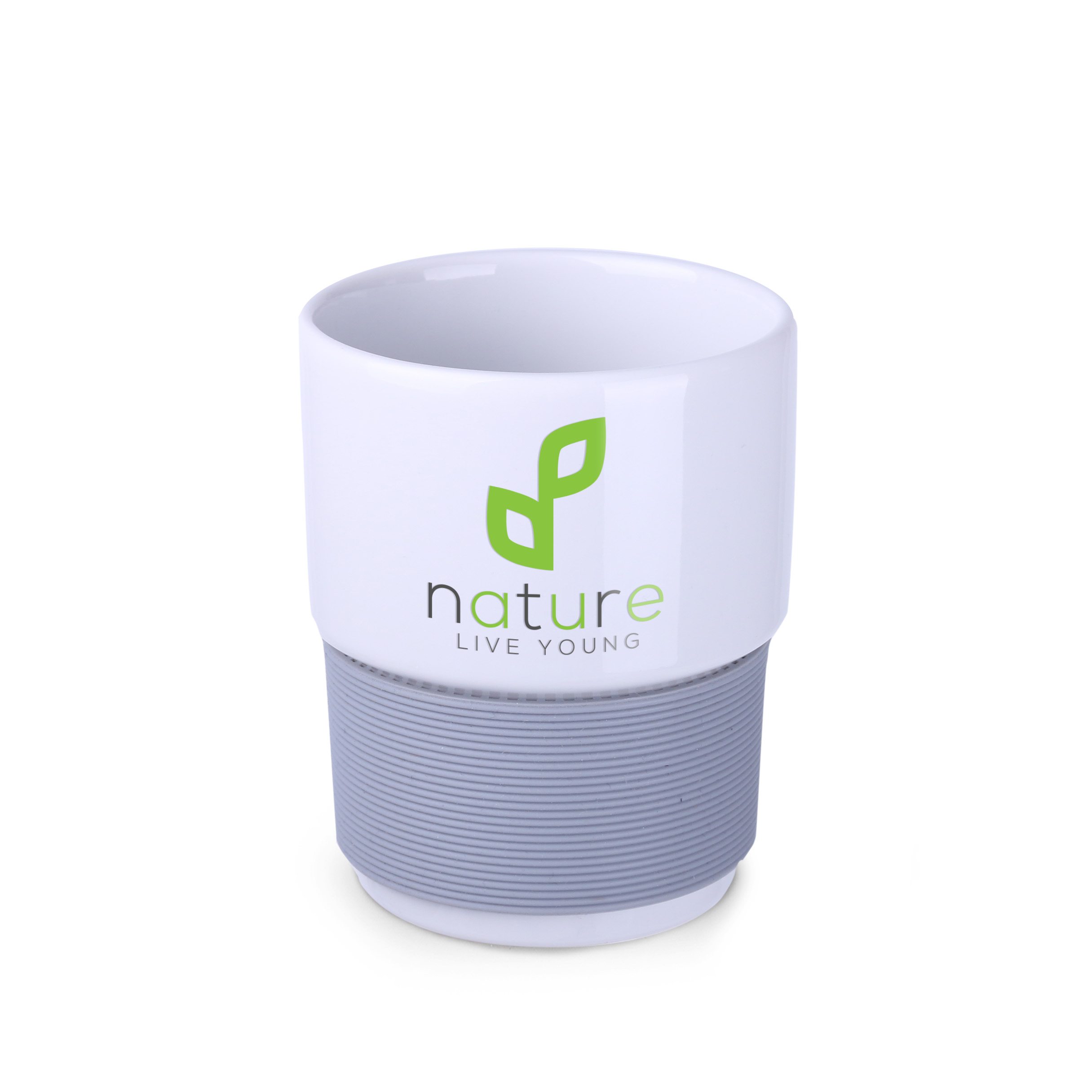 A retro-style model with a simple design, made of European porcelain. Its shape allows for stacking. It has a 40 mm thick elastic band available in various colors, which protects your hands against burns.