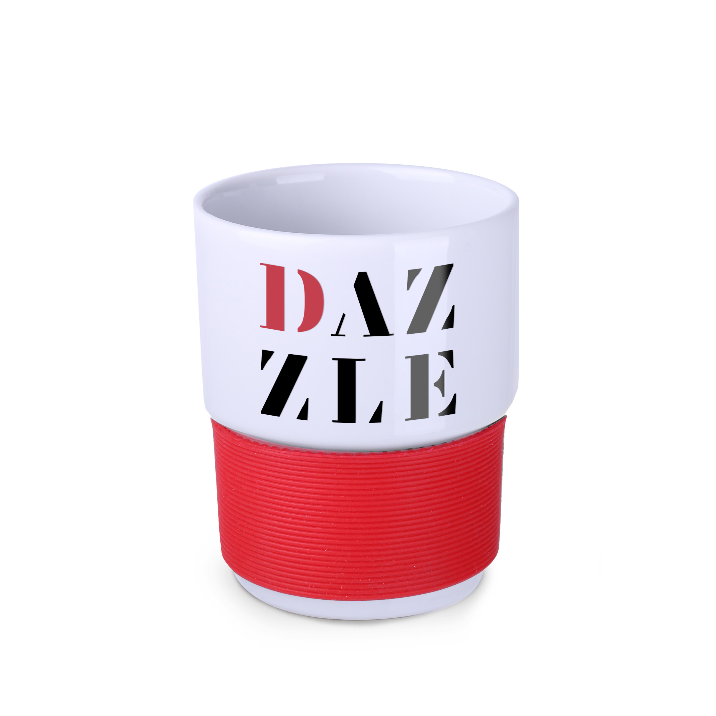 A retro-style model with a simple design, made of European porcelain. Its shape allows for stacking. It has a 40 mm thick elastic band available in various colors, which protects your hands against burns.