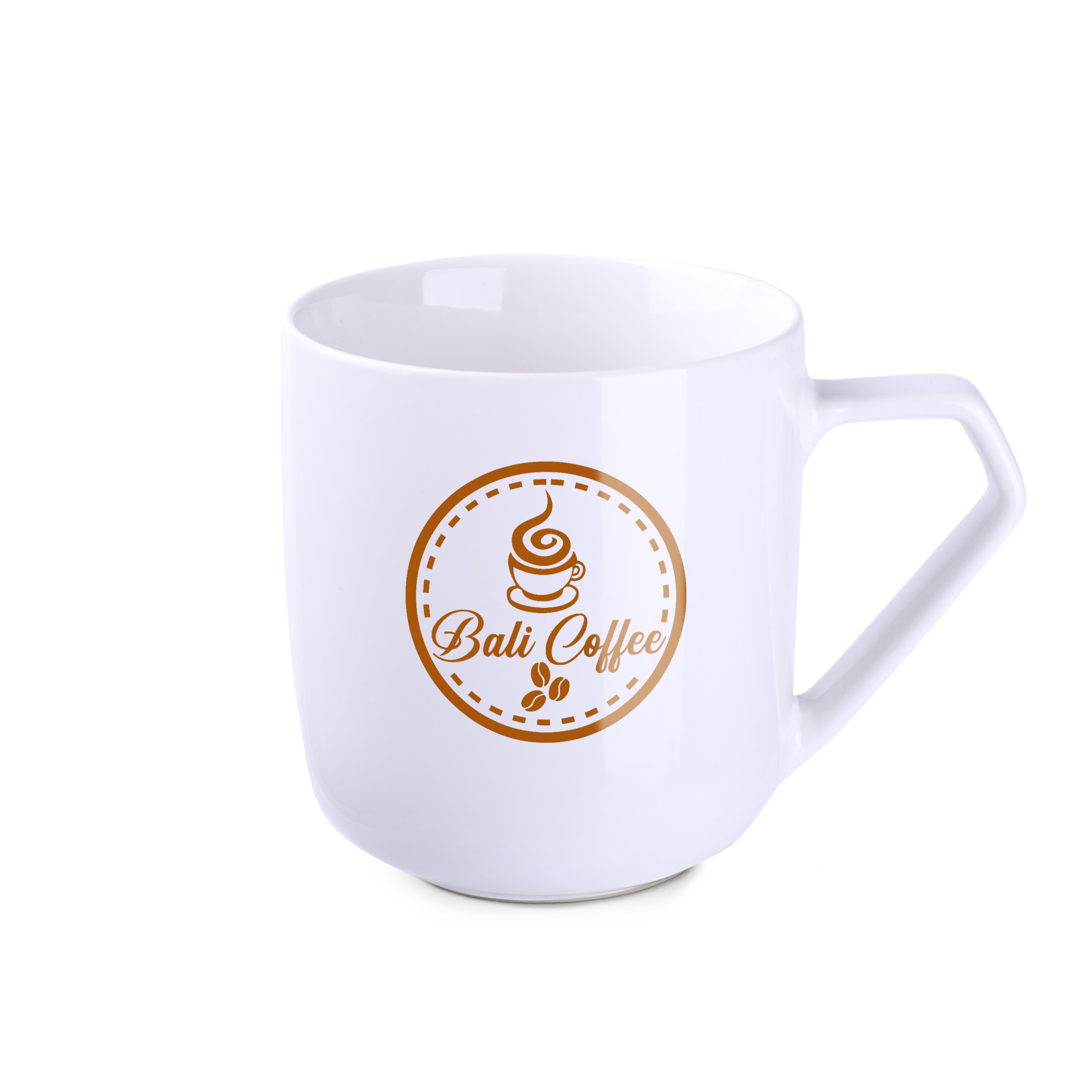 A barrel-shaped porcelain mug with an original handle. Combined with decoration, it will uniquely distinguish the brand from the competition.