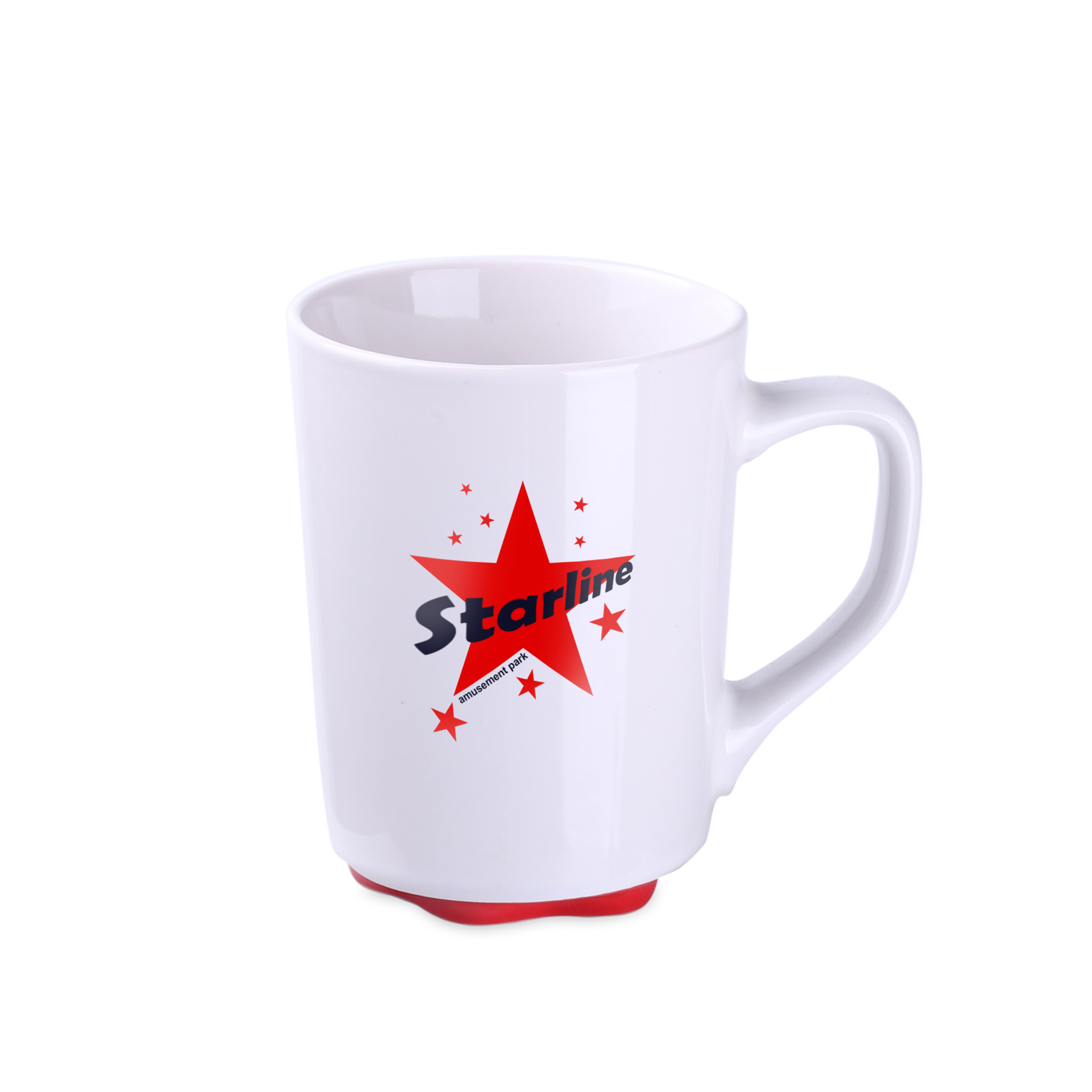 A white mug with an original and interesting bottom available in several colors. Straight walls offer great possibilities for decorations.