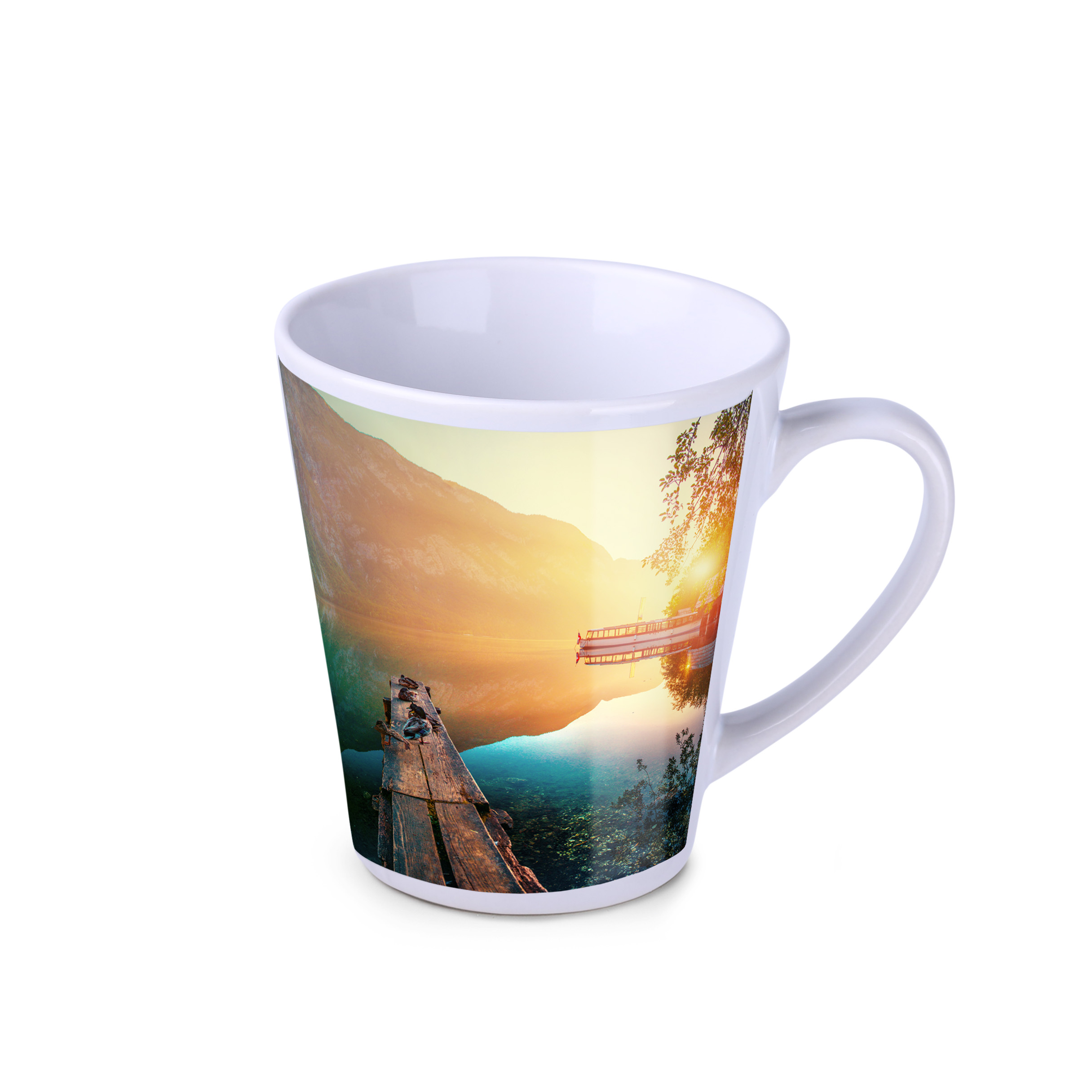 A sublimation mug with a classic trapezoidal shape. It can be printed in photographic quality. It has an ergonomic handle.