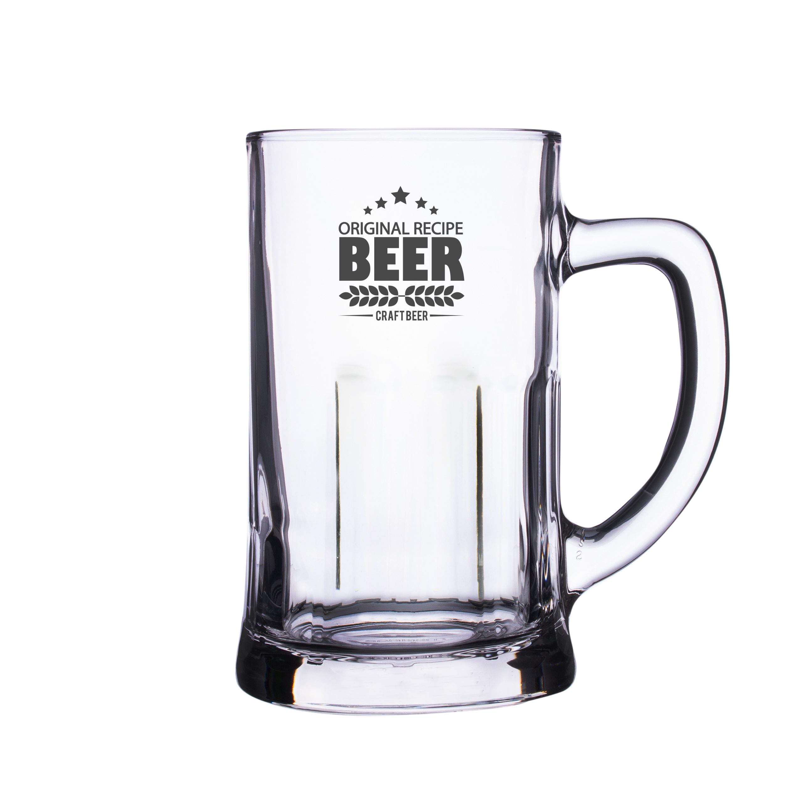 Massive beer mug with thick walls. It has a comfortable handle and characteristic grooves at the bottom.