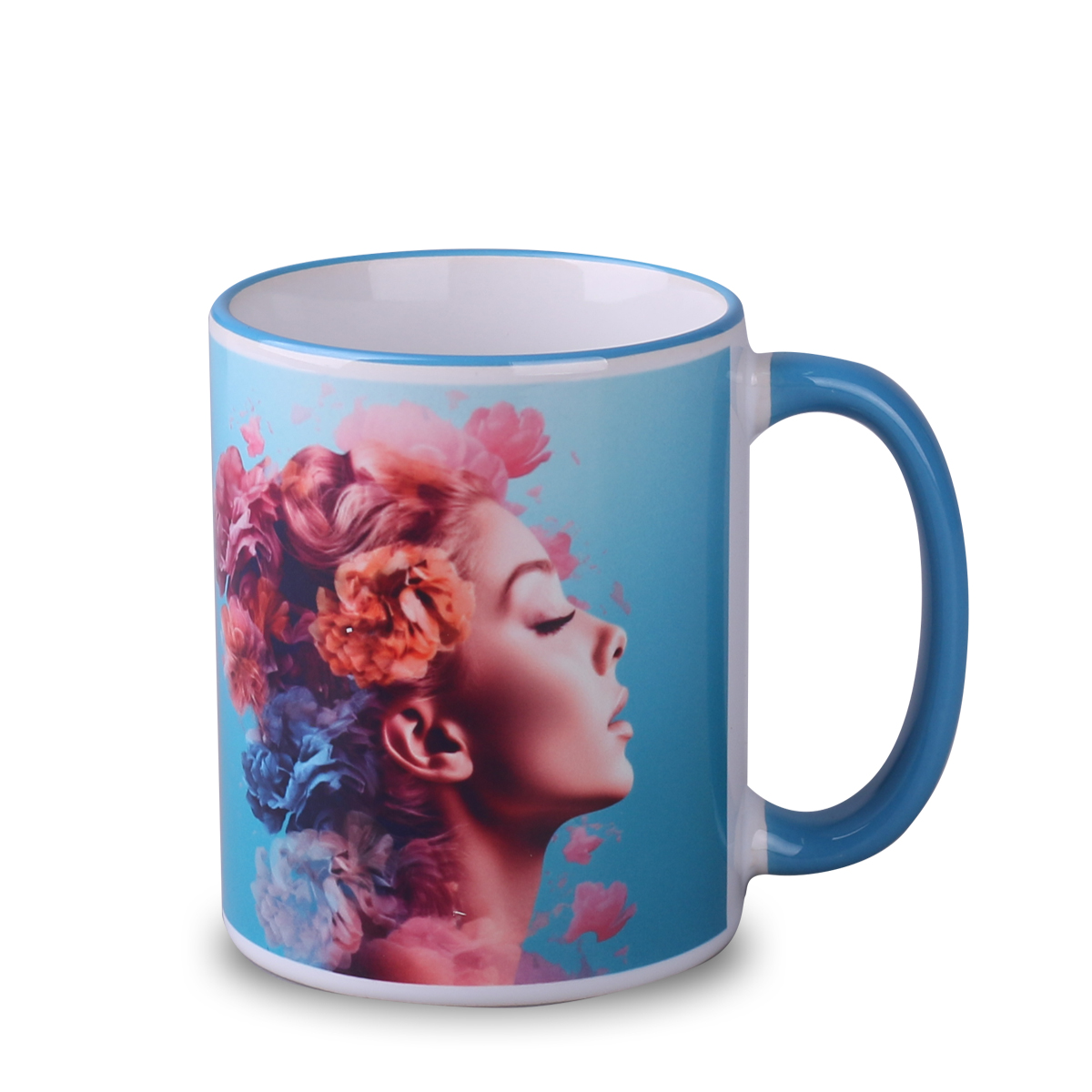 An exceptionally colorful sublimation mug with a simple shape. Perfect for applying photo-quality prints. What makes it stand out are the edges and handles colored in many colors.